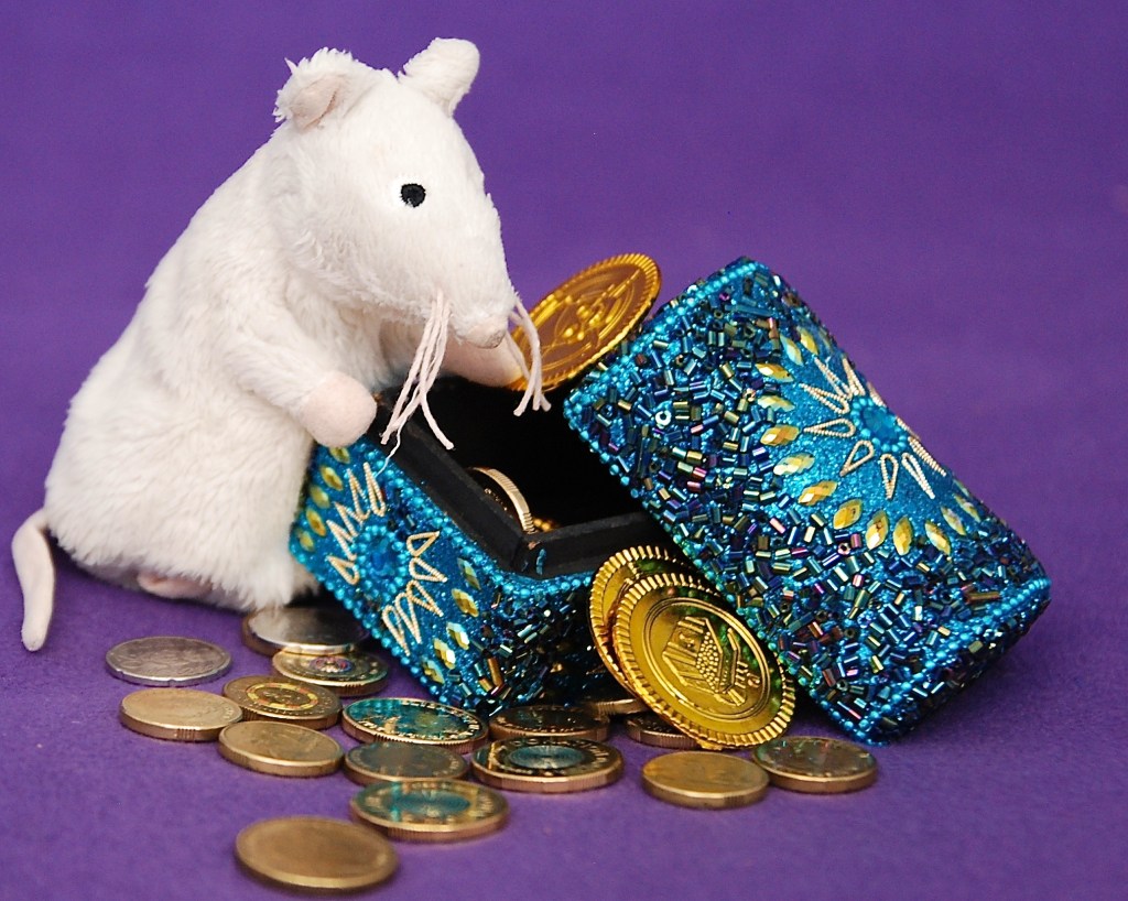 Ratty nibbled on the treasure trove. It was certainly not edible. A pity. Even so, Something Would Have To Be Done. He decided that he must keep the trove safe for until its mysterious owner returned. What better way to keep it safe than by investing it! That way he could create even more treasure that he could also then proudly hand over (with paws) to the owner. Who knows, the owner might be so pleased that they would reward Ratty, perhaps with Jarlsberg cheese.