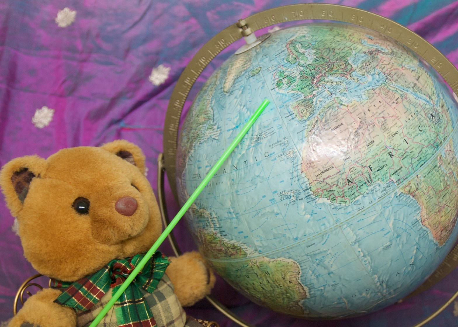 Scotty heard that the Guardians were going to visit Scotland (and England and Wales and the Isle of Man) . They would need a navigator and bodyguard. He volunteered for the job. He started by finding out where on earth Scotland is. He consulted his trusty globe. Now Scotty lives in Perth, Australia. Scotland, which also has a city in it called Perth, is about as far away from Australia’s Perth as a bear can get. Scotty had to go around to the other side of his globe to even point to it. That’s how far it is.