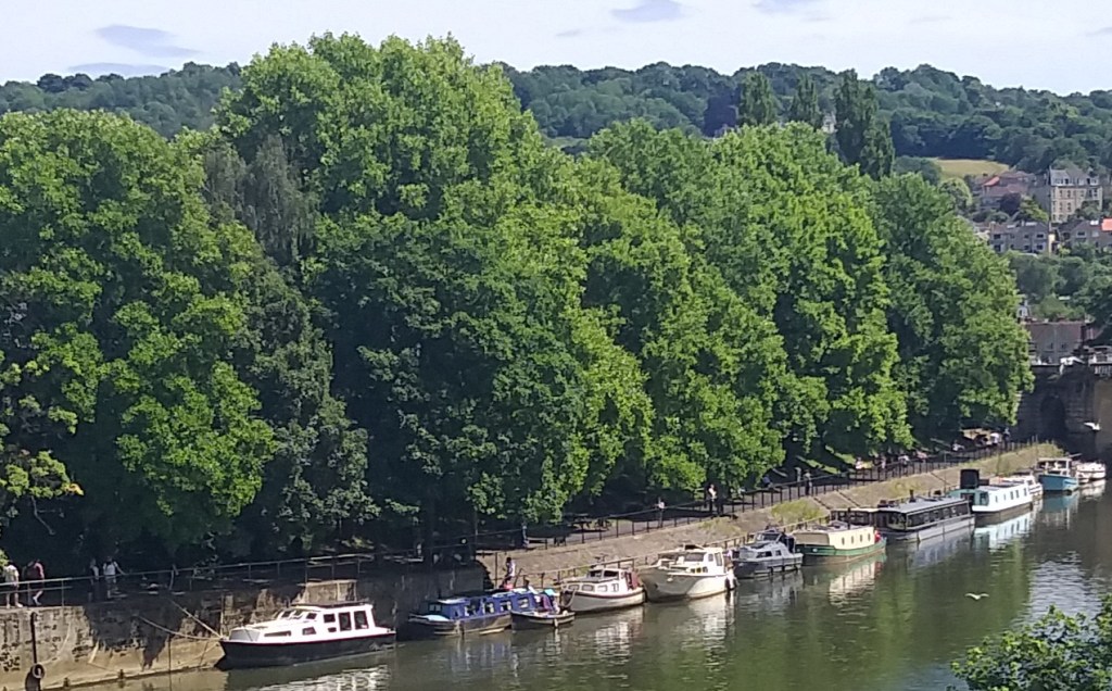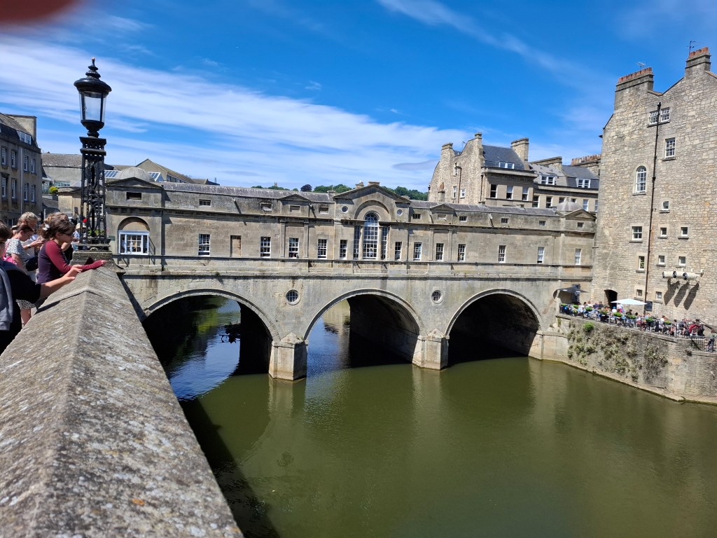 There is a river called Avon with long thin boats on it. They are thin so they can go down thin rivers and canals. There was a splendid old bridge, called Pulteney Bridge, and a lot of elegant Georgian buildings built around the 1770’s when a chap called George was King-ing and giving his name to a whole architectural style.
