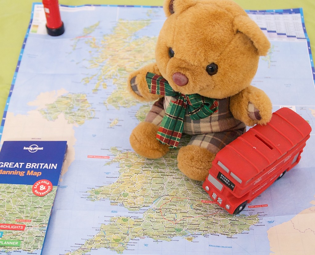 Scotland the Brave flew all the way from Perth in Western Australia to London. After two days of exploring London he and the Guardians boarded their tour bus and set off to see Scotland, or so Scotty thought**. To his dismay the bus went the wrong way! He consulted his maps. They were travelling west instead of north!