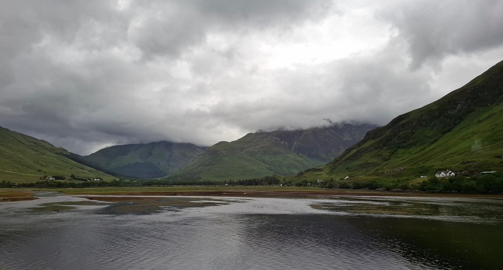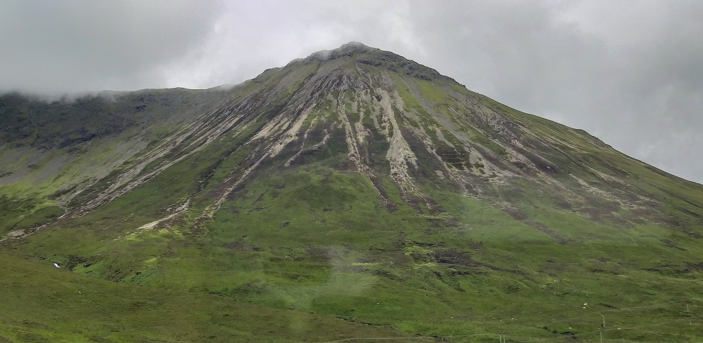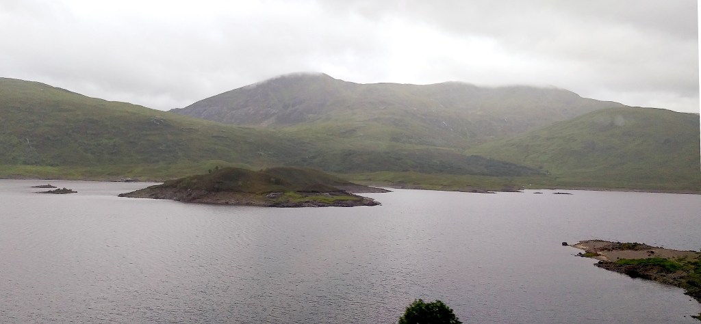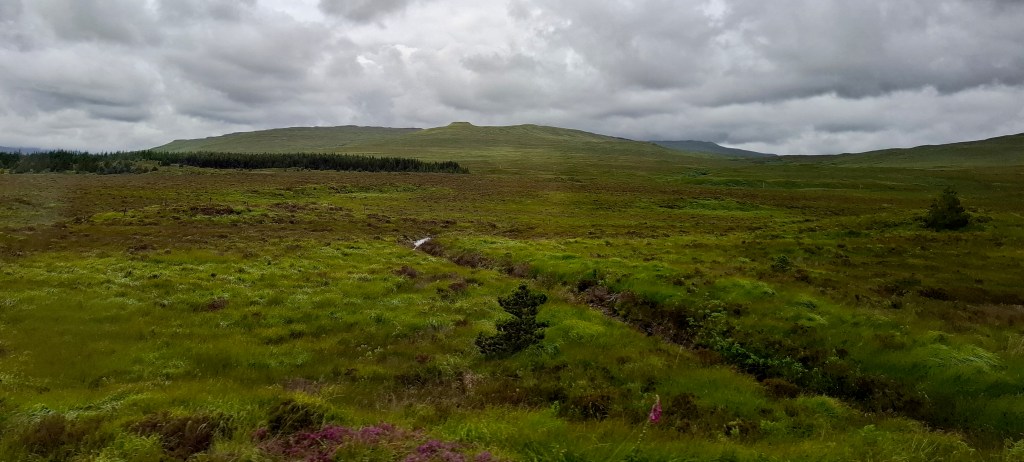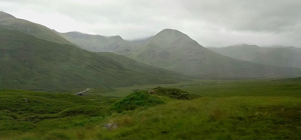 The flattish lands between are soggy and covered with moor heather. Between the rain showers, the landscape looks dramatic and sombre. And this was in summer.