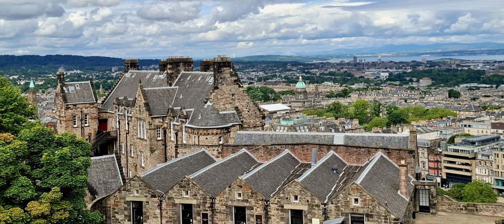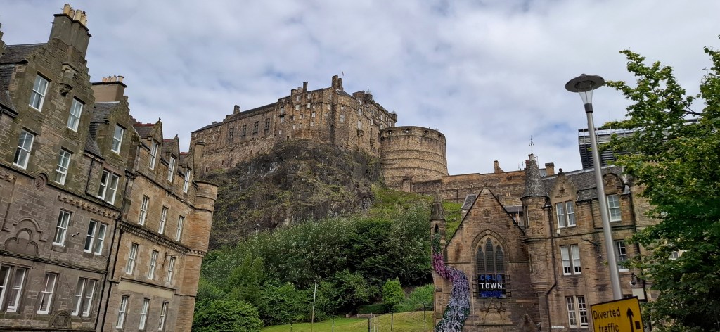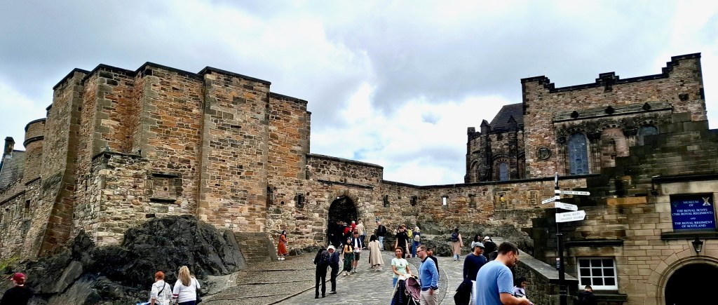 Scotty was happy to now stand atop this castle of castles, Edinburgh Castle, and survey the city below. But first, you have to get up there. The castle is enormous and has a whole hilltop to itself, and it towers, or looms, over the city.